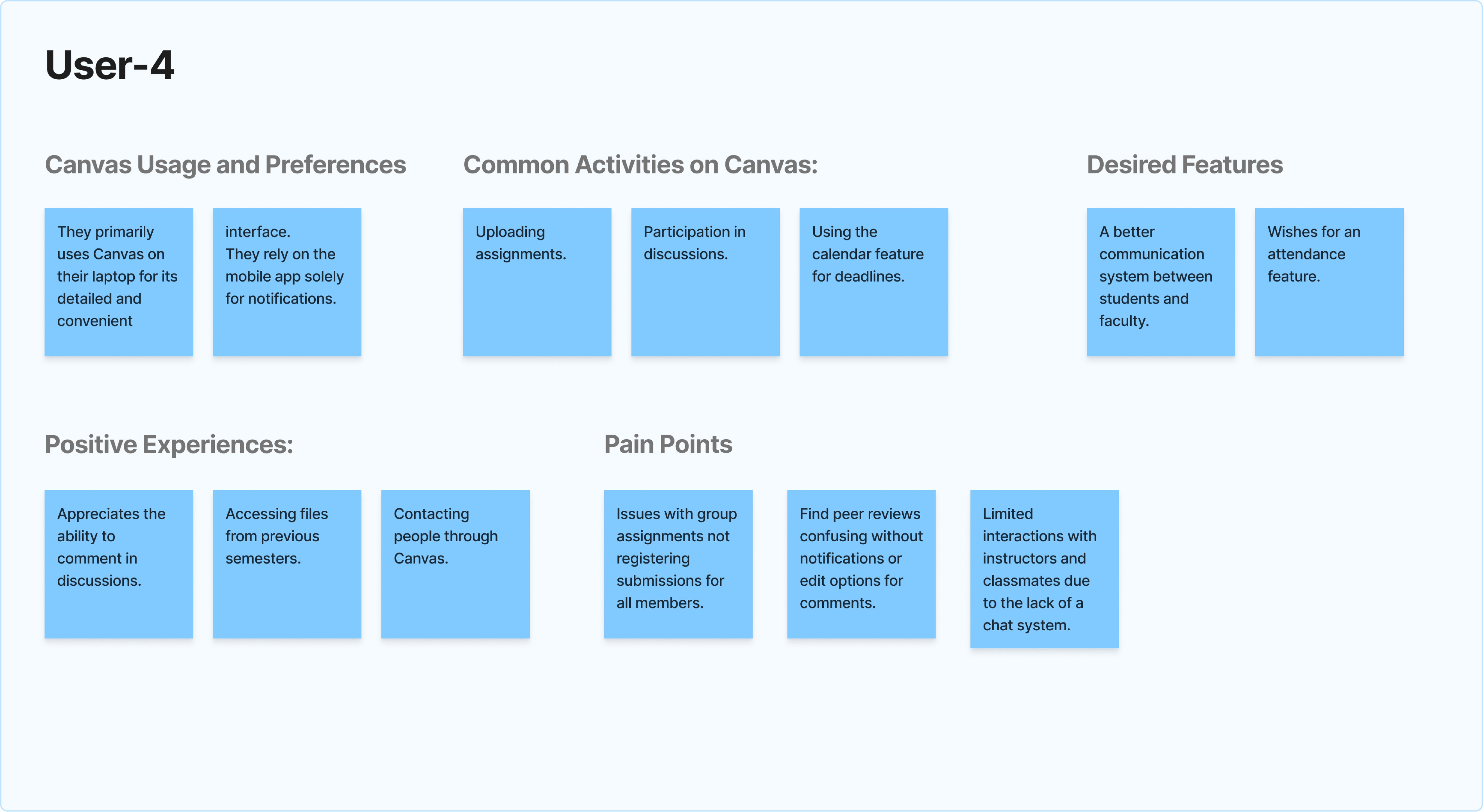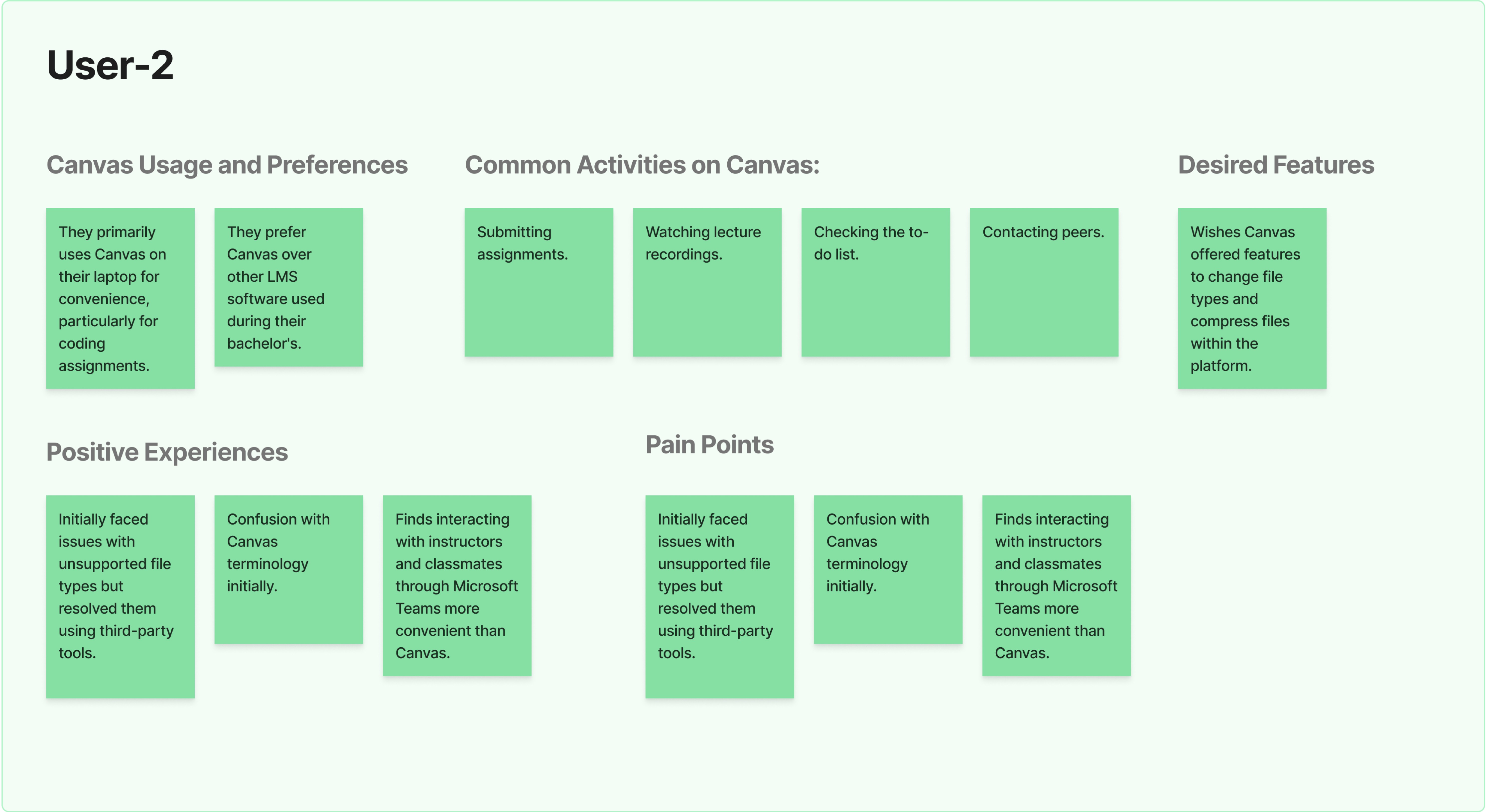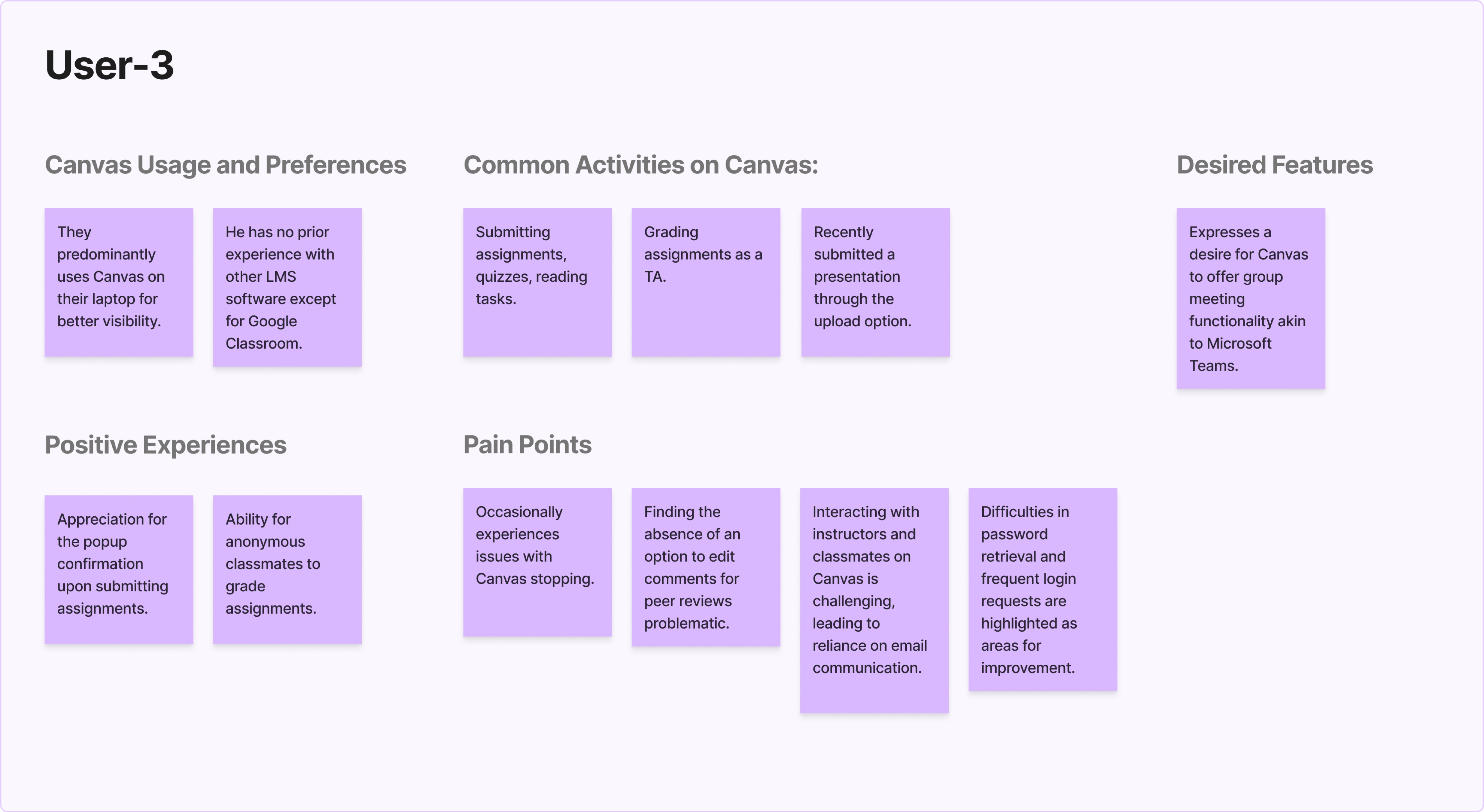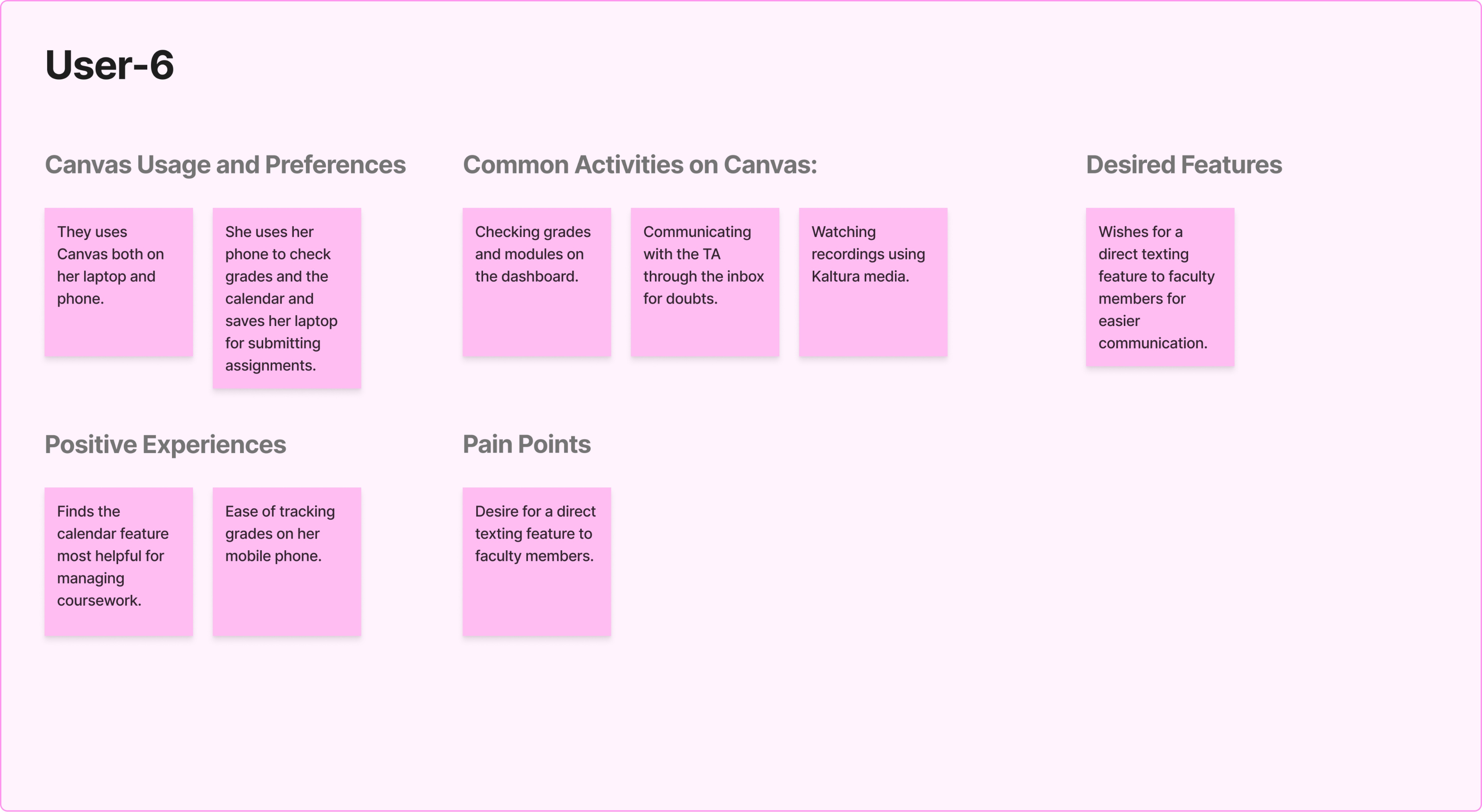 We conducted six interviews with graduate students from different fields and roles, including Teaching Assistants, to understand their personal experiences with Canvas. This gave us a deeper understanding of the problems that users face and their expectations of the software.