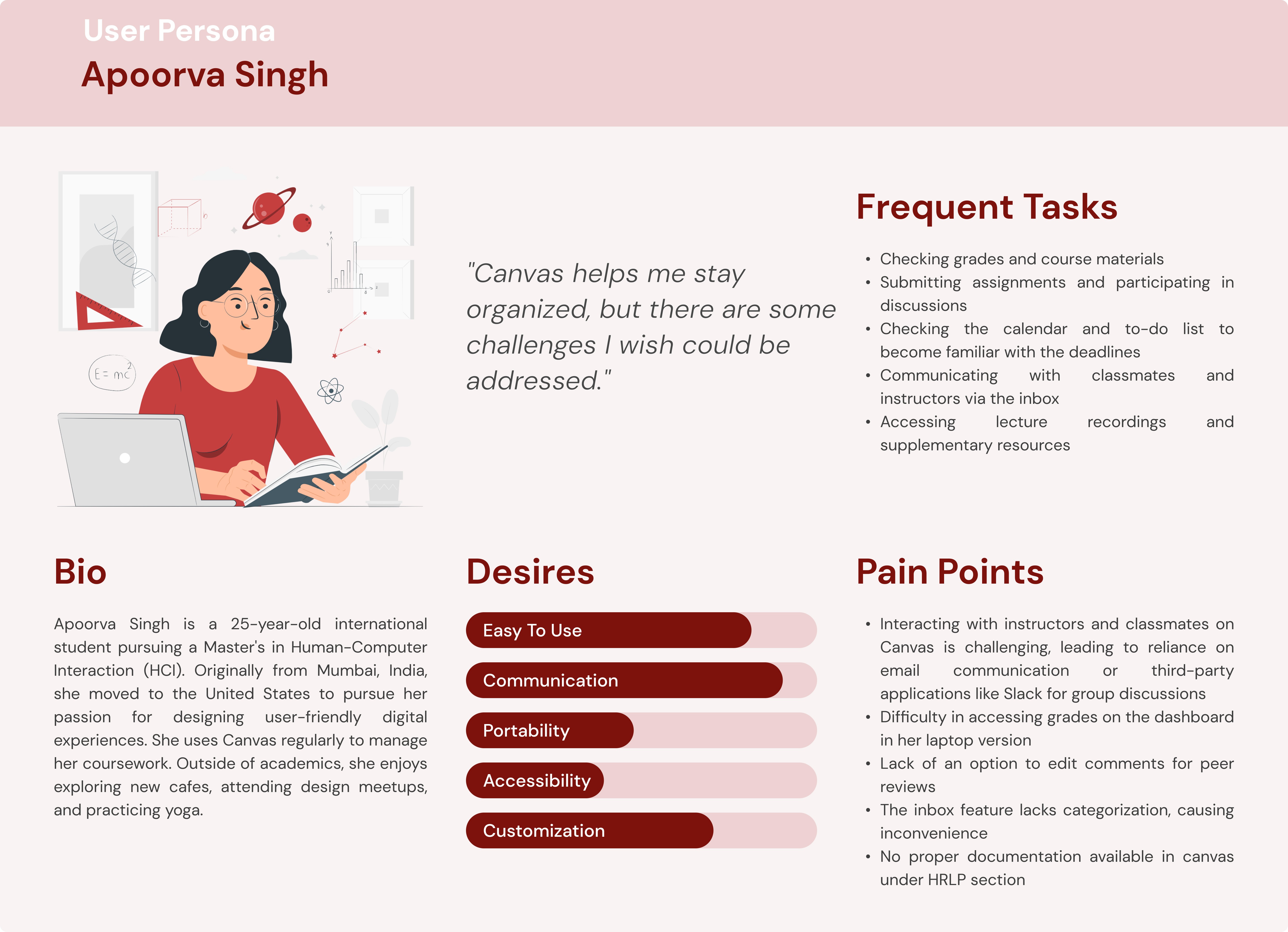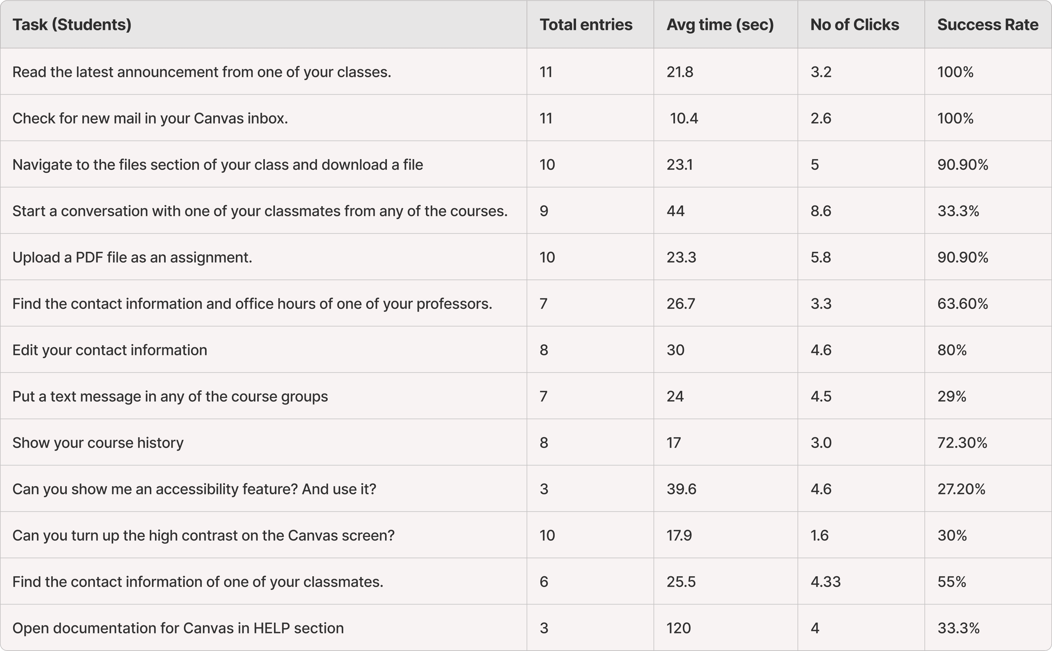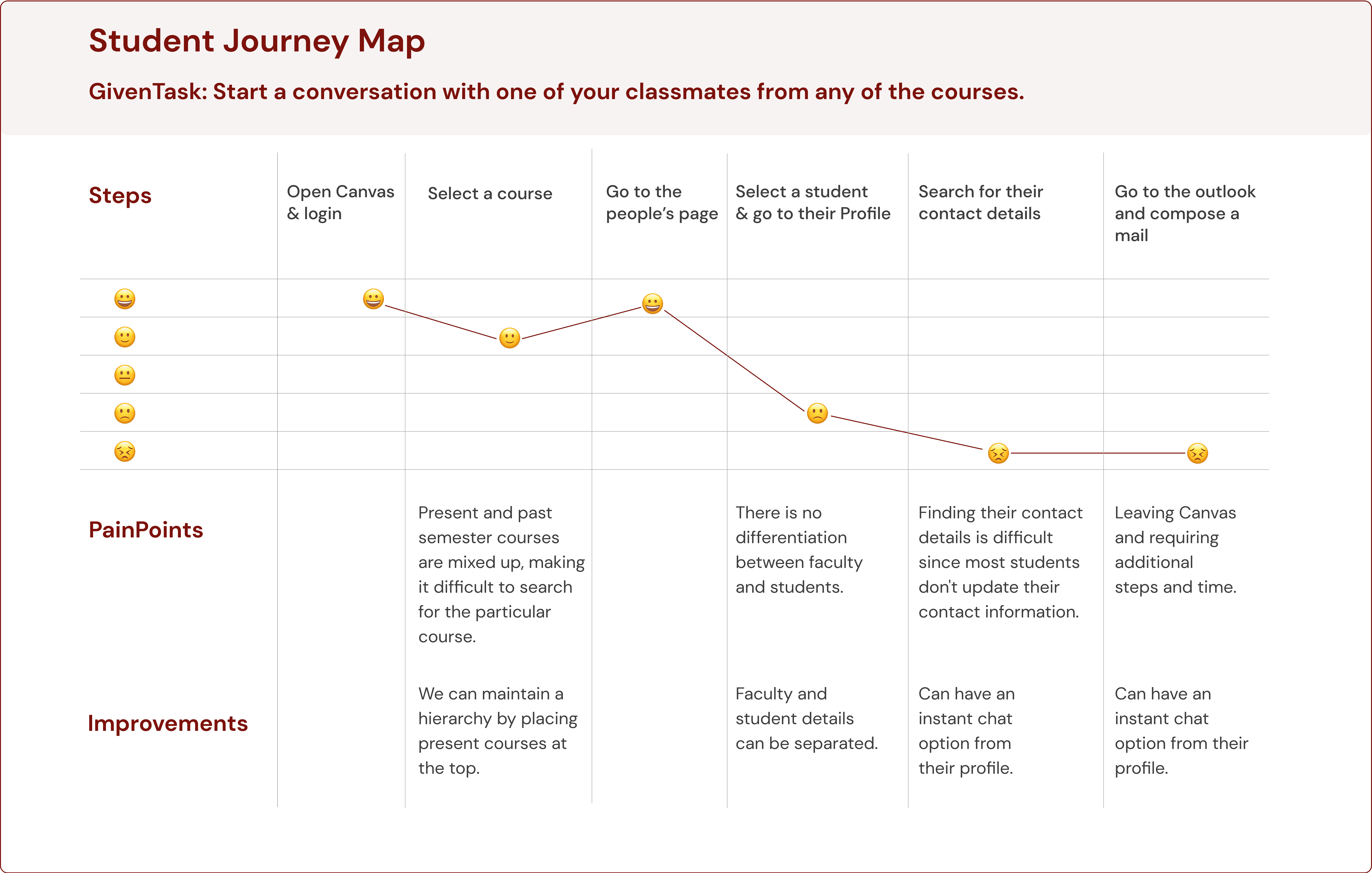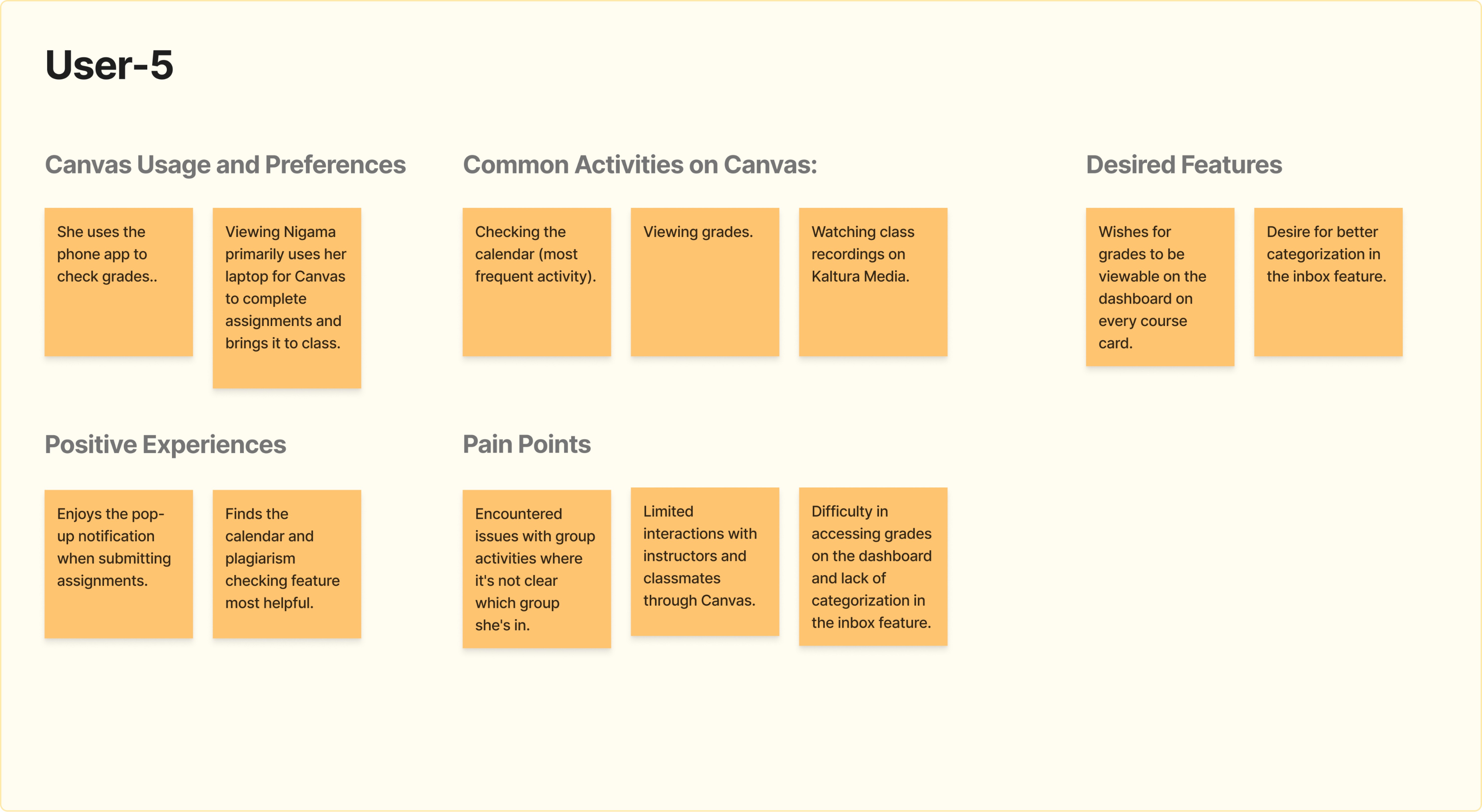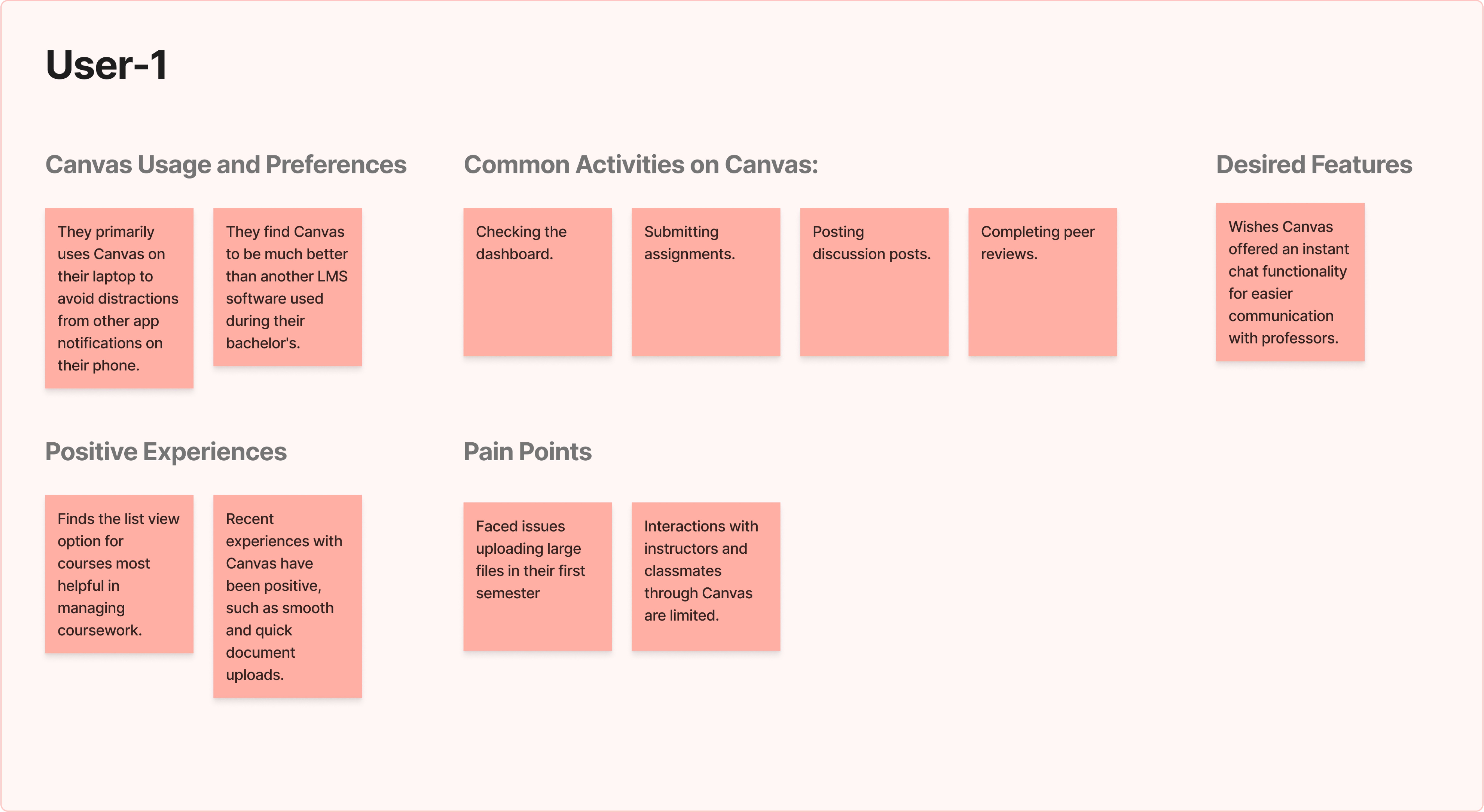We conducted six interviews with graduate students from different fields and roles, including Teaching Assistants, to understand their personal experiences with Canvas. This gave us a deeper understanding of the problems that users face and their expectations of the software.