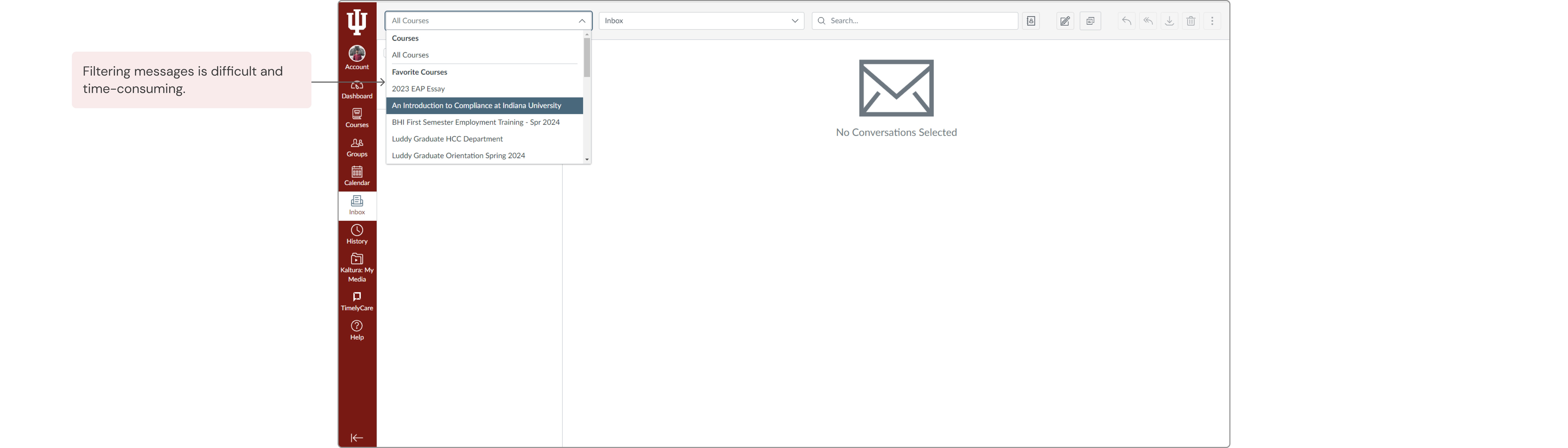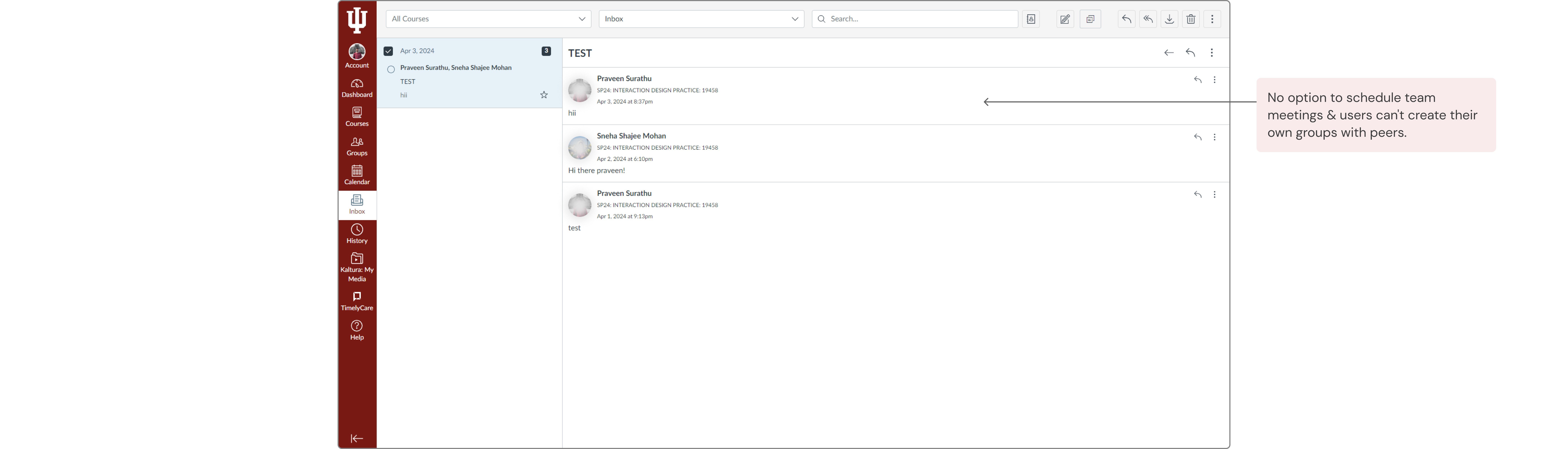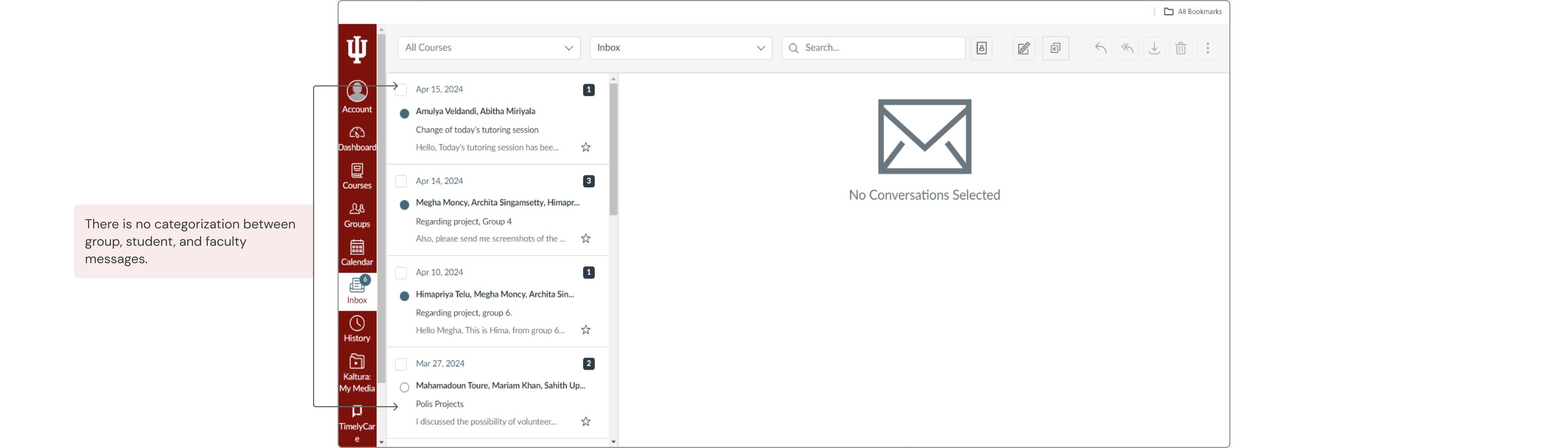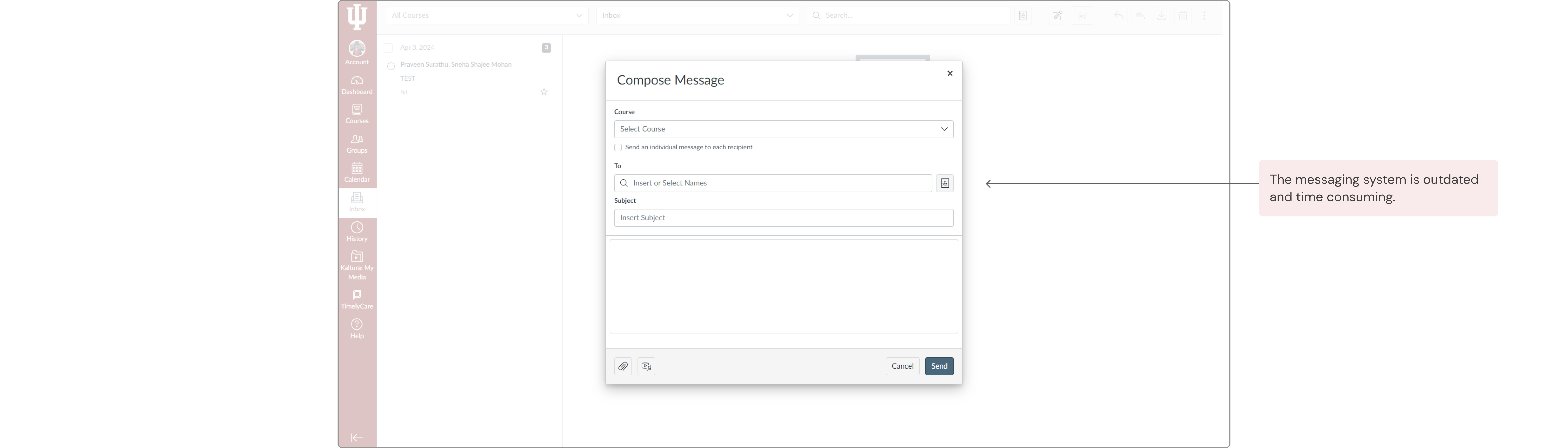 Through our research, we came to know that in the current Canvas platform, users face issues with the Inbox feature making it difficult to communicate with other students and faculty, leading them to rely more on third-party applications. Below are some of the problems we identified in the existing Canvas platform.
