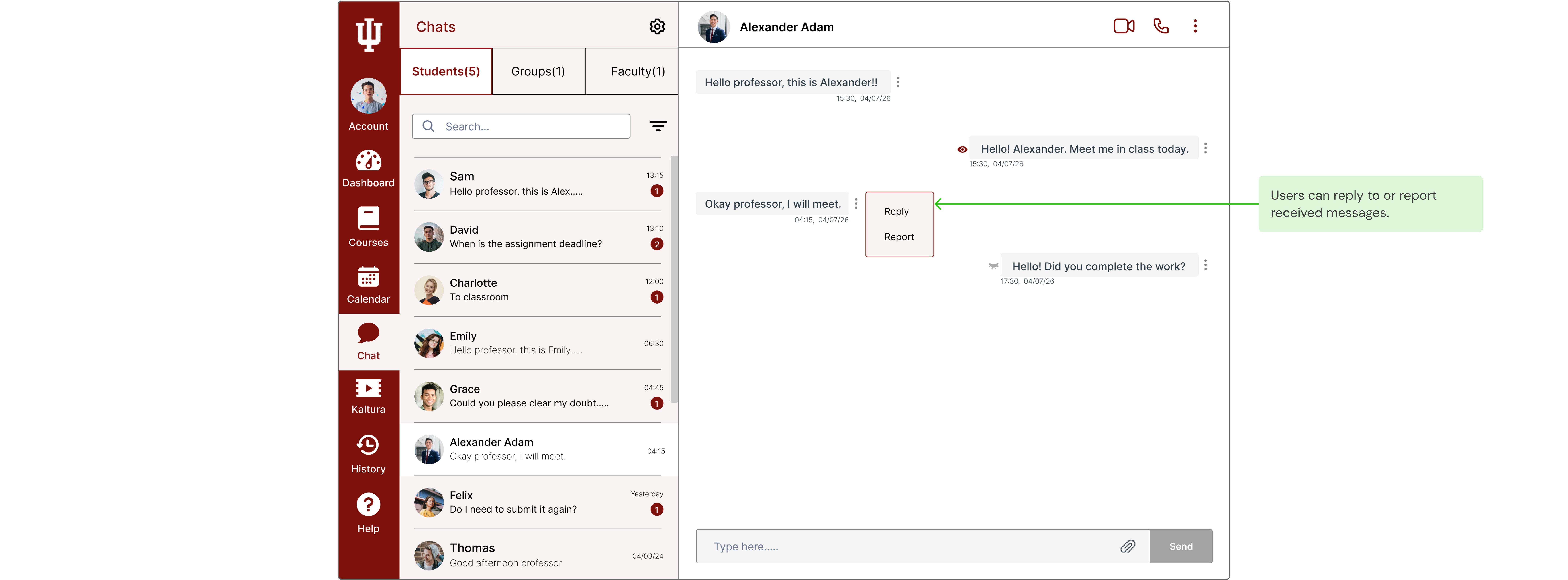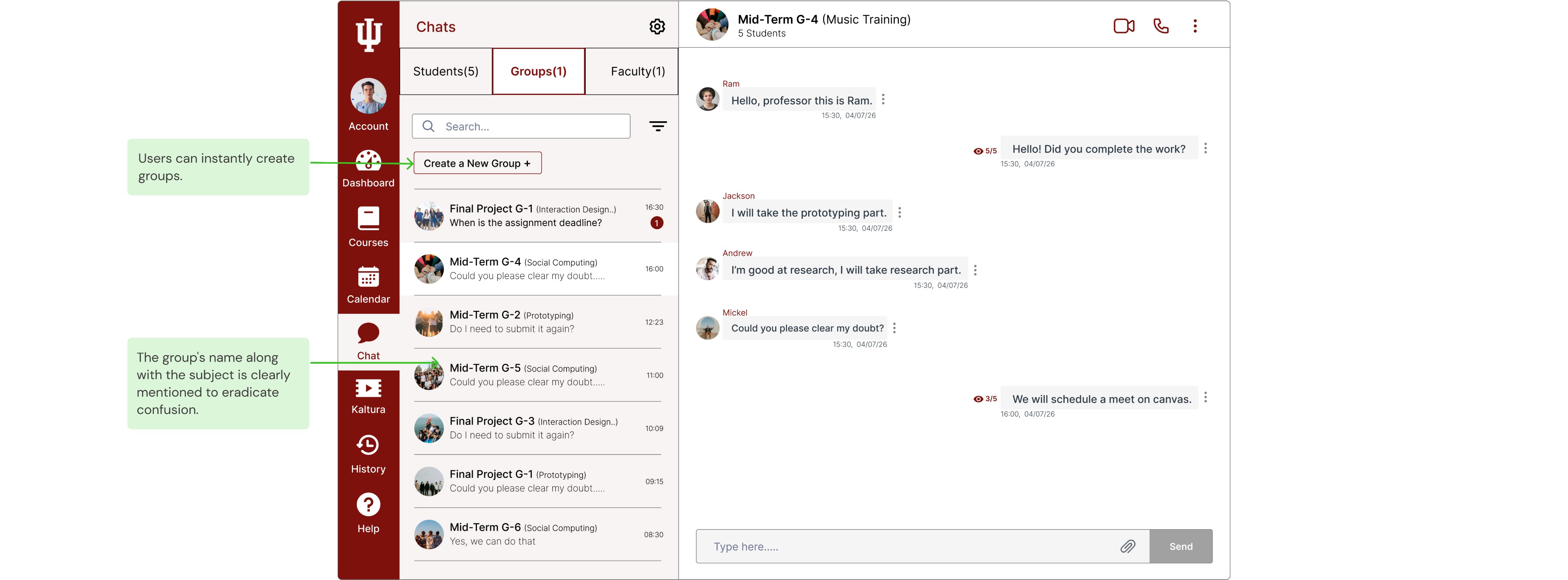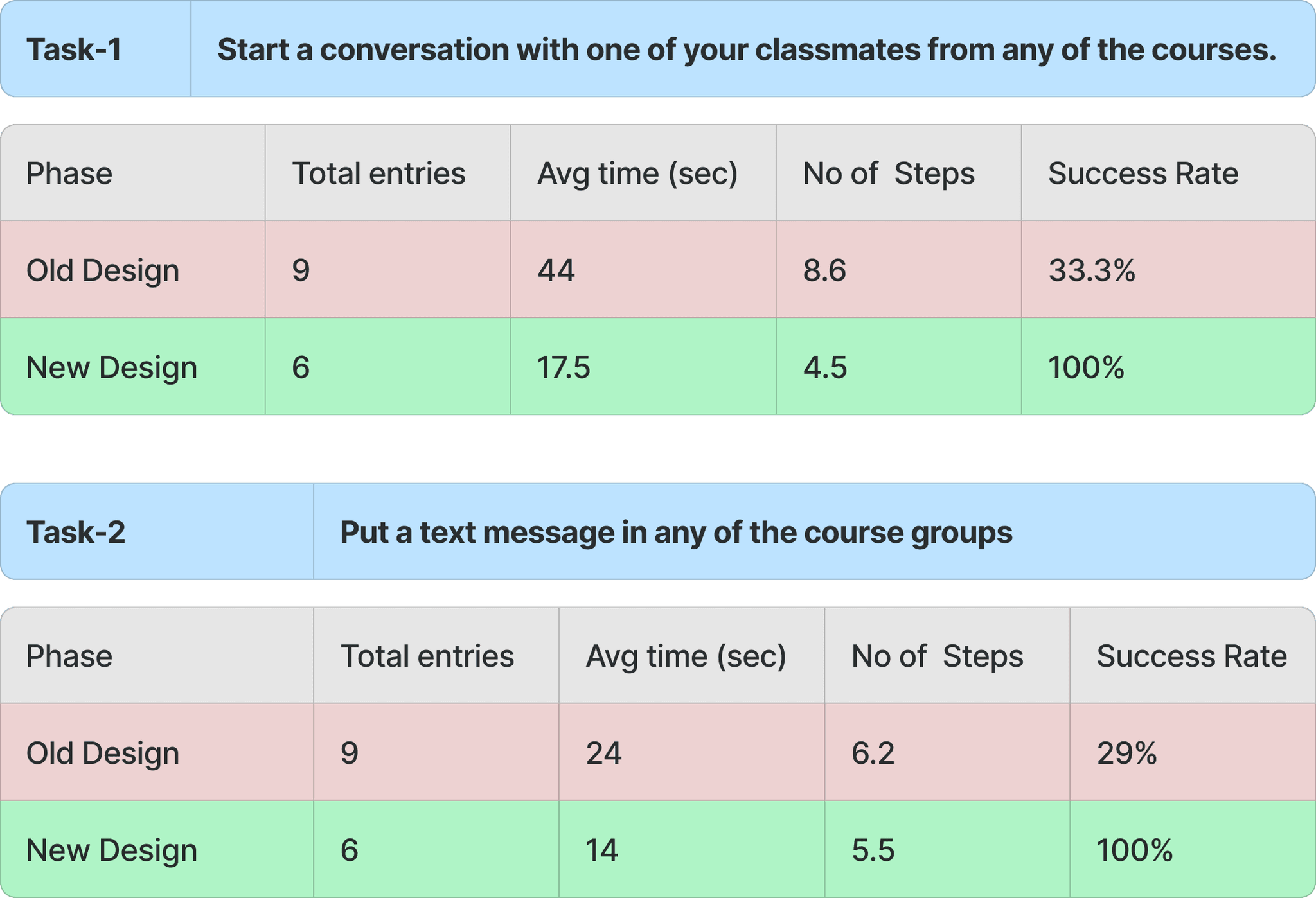 We conducted think-aloud testing with six participants to evaluate the new design. We assigned two tasks: the first was to "Start a conversation with one of your classmates from any of the courses," and the second was to "Send a text message in any of the course groups."