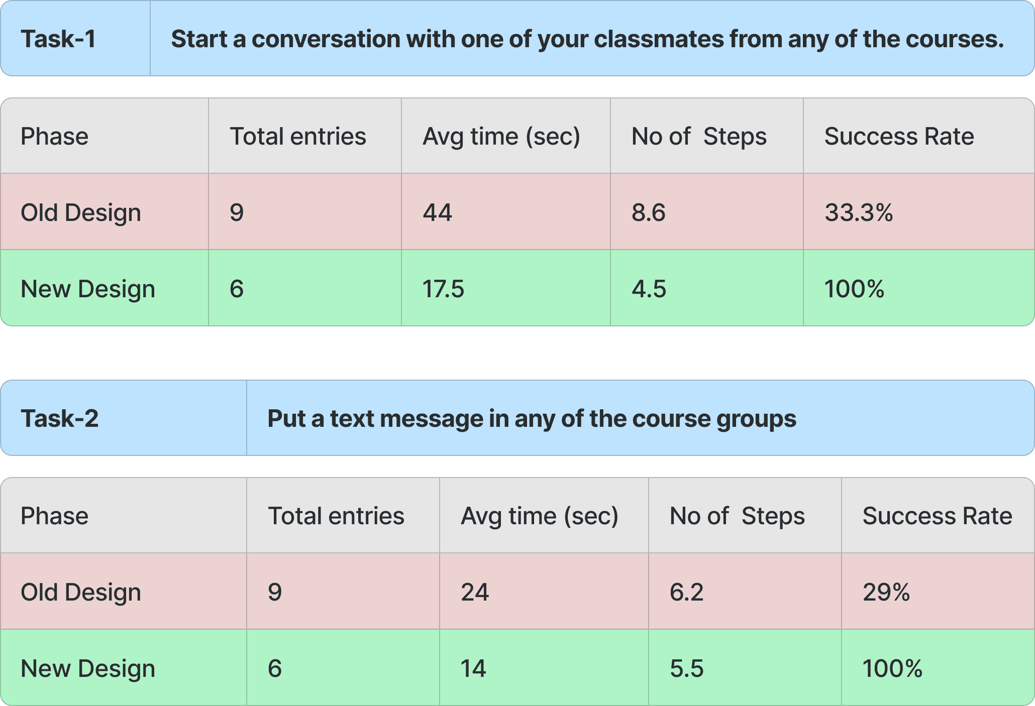 From the testing, we clearly observed a 100% success rate that was achieved in less time and with fewer clicks compared to the metrics recorded from the initial observational tasks of the existing design.