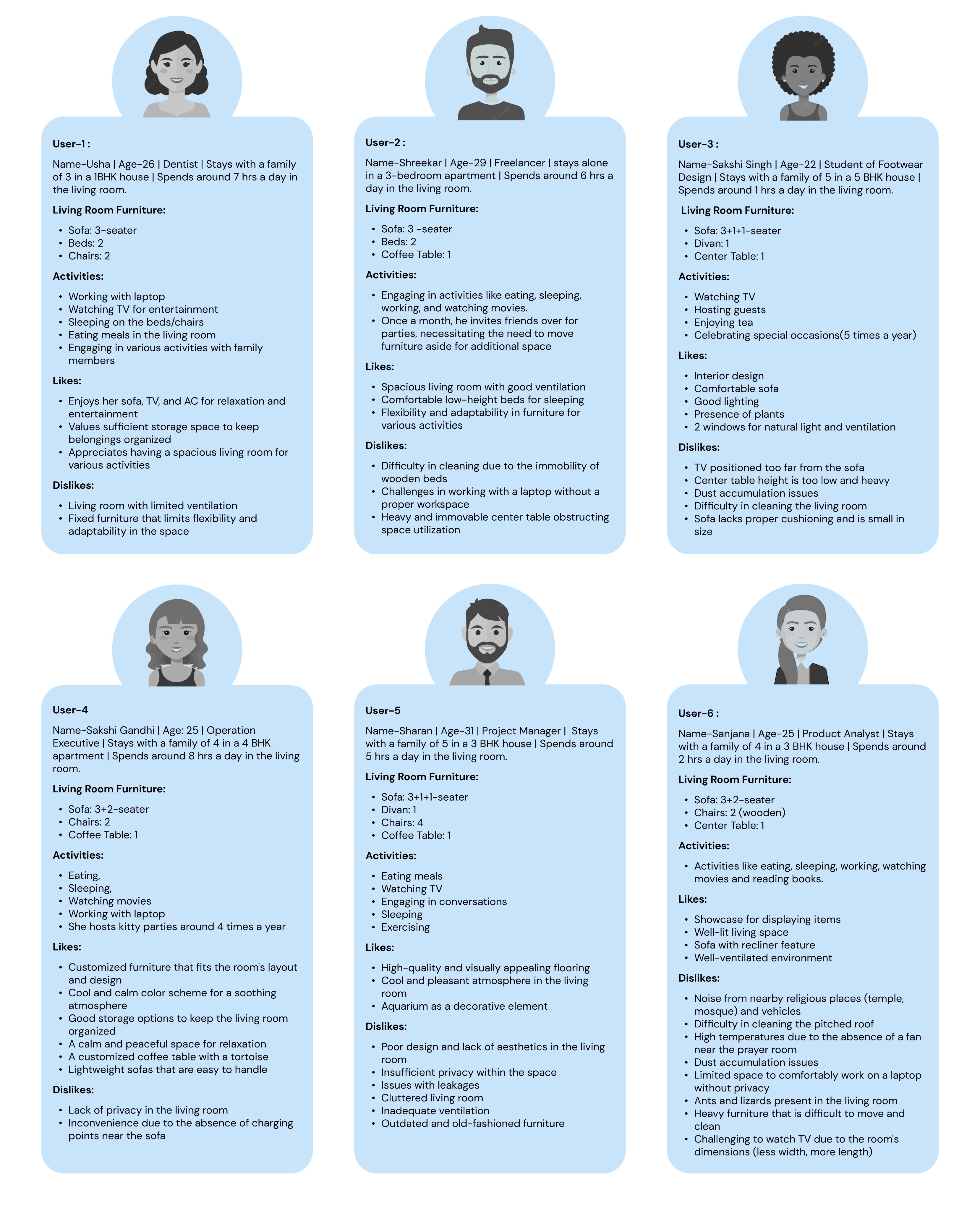 To start the process, I interviewed six of my teammates, considering them as users of the living room. Asking them how they interact in their current scenarios helped in understanding their pain points. By actively listening to their experiences, I gained valuable insights into the challenges they face and the areas needing improvement. At this stage, I aimed to connect with the users, understand, and immerse myself in their perspective, avoiding any bias by not considering myself as a user.