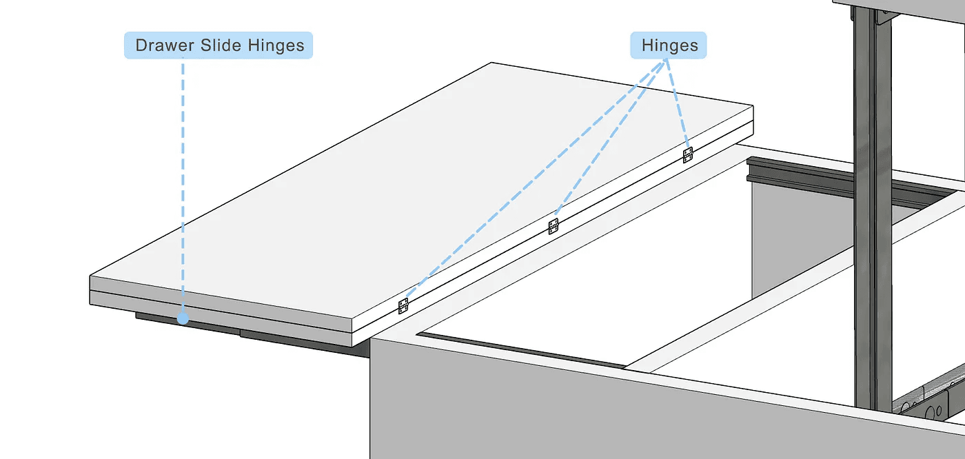 ‘Drawer slide hinges’ are used to facilitate the linear movement of the coffee table’s right part.