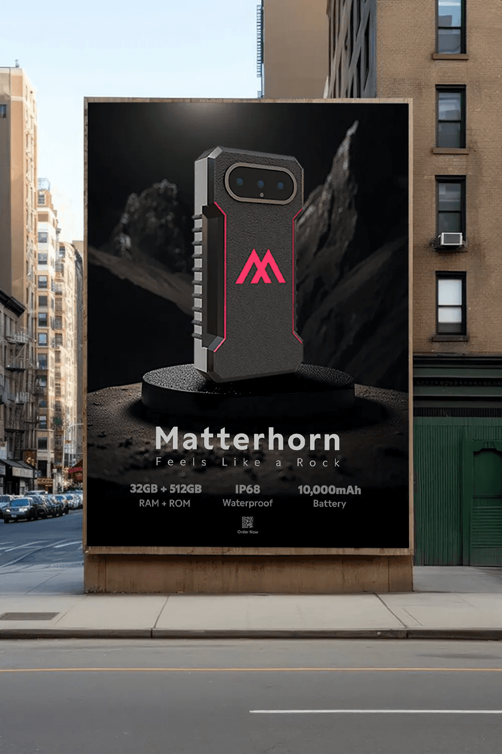 A 20-second commercial video showcasing the product’s features. Billboards and posters emphasizing key product attributes. A brand logo inspired by the iconic Matterhorn mountain and its rugged design language. A cohesive brand guideline with typography, colors, and visual identity. An animated GIF for online promotions.