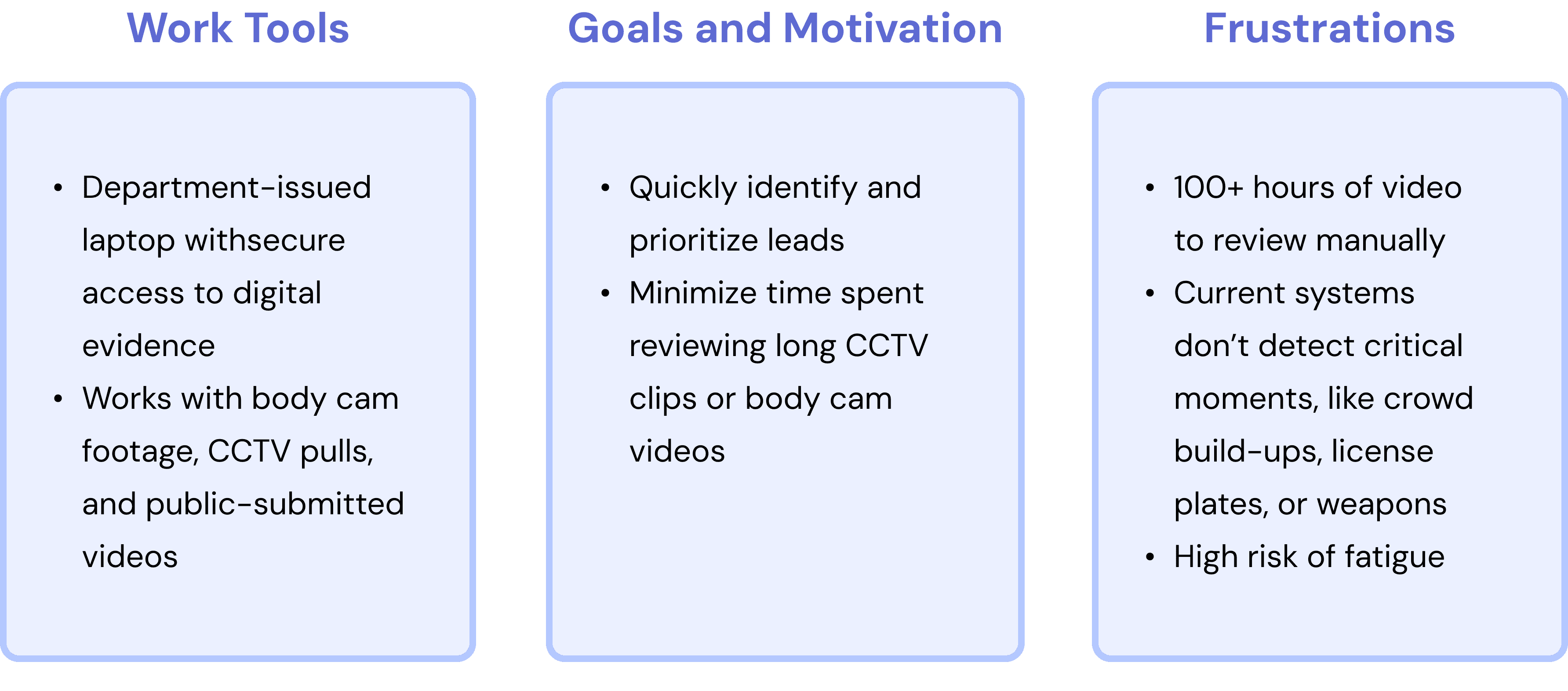 Detectives spend a lot of time watching hours of video footage and organizing different kinds of evidence. Most of their tools are outdated and don’t work well together, which makes it hard to find key clues quickly. Because of this, investigations take longer and important leads can get missed.